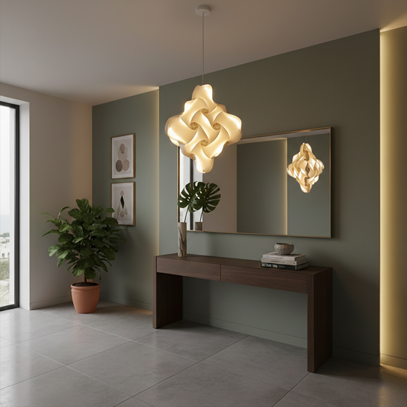 Chaque angle de la Lampe Suspension S027 reflète un savoir-faire artisanal unique et moderne. Ainsi, elle sublime votre demeure avec une sophistication rare et une clarté enveloppante. D’abord, nous utilisons du polypropylène translucide pour sa capacité à sculpter la lumière. Par conséquent, la diffusion reste homogène malgré les dimensions impressionnantes du luminaire. Ensuite, sa hauteur de 48 cm garantit une visibilité majestueuse sous votre plafond. De cette manière, elle devient le point focal indispensable de votre hall d’entrée. En outre, son style « diamant » s’harmonise avec les décors les plus raffinés. Enfin, sa légèreté facilite son installation.